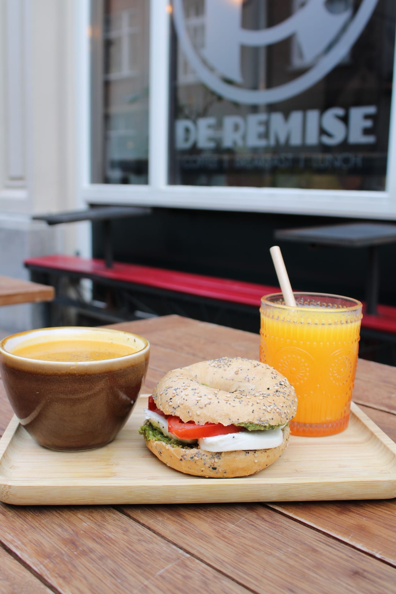 koffie, jus d’orange, croissantje, yoghurt met granola en een bagel ei & bacon