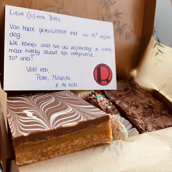 Box gevuld met millionaire slice met een dikke caramel laag, een smeuïge chocolade brownie & heerlijke cakeballs in de smaken Lemon, Carrotcake & Confetti!