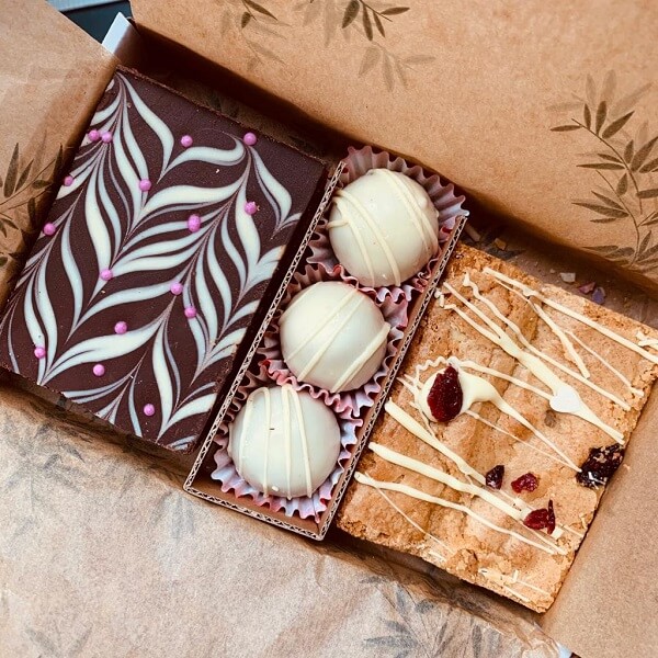 Deze box bevat een Millionaire Slice (mét Frambozen Caramel en donkere chocolade), Red Velvet bites & een lekkere smeuïge Blondie met zoete cranberries.