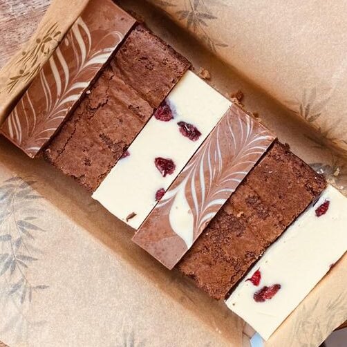 Ben jij helemaal gecharmeerd van deze gestreepte feestbox? Hij is gevuld met een proeverij van onze lekkerste millionaire slices, smeuïge chocolate brownie & zoetste blondies.
